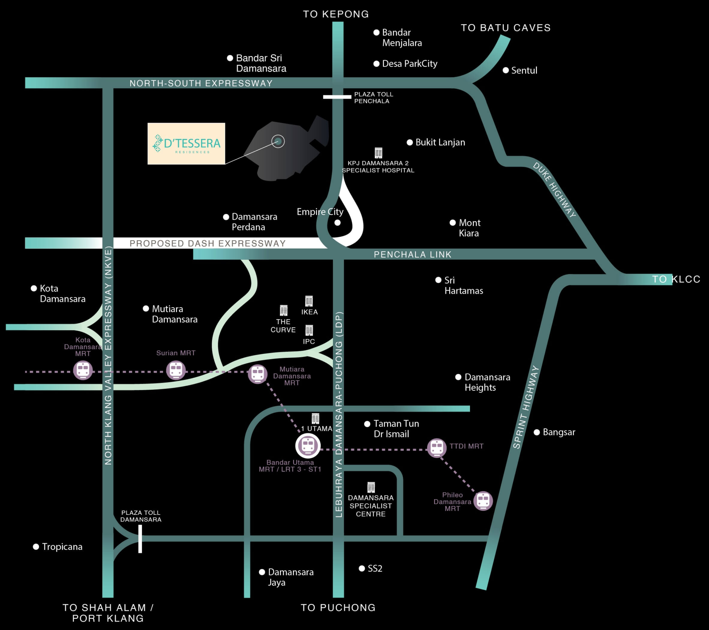 D’Tessera enjoys a strategic location in what’s often called the “Golden Triangle” of Petaling Jaya. It is near established hubs such as Mutiara Damansara, Bandar Utama, TTDI and Kota Damansara. The development is well-connected via major expressways including the LDP, Penchala Link and the upcoming DASH, meaning fast access to central KL and the wider Klang Valley.